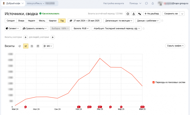 Наша компания CapsGROUP продвигая сайт клиента в поисковых системах Яндекс и Googleкратно увеличила посещаемость сайта dobryicoffee.ru, а так же улучшила позиции сайта до ТОП-10